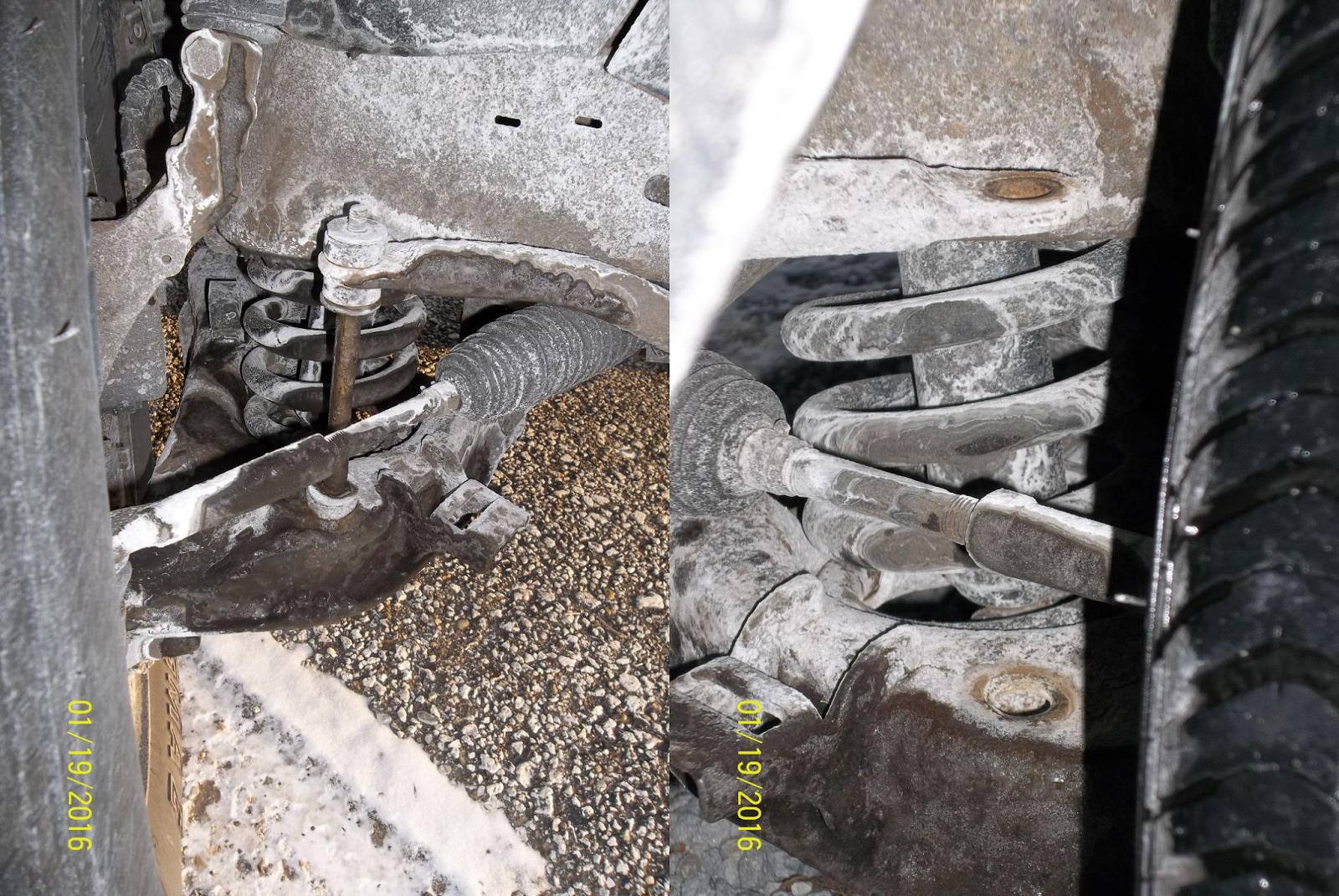 A couple days ago, I was driving and heard a clunk, followed by some pinging noises. Upon looking in the rear-view mirror, I noticed a rod-shaped item bouncing in the roadway and thought I must have driven over some trash in the road. A few minutes later, I heard more noises and saw more objects rolling around in the road behind me. I also noticed the handling was suddenly really "loose". Then I realized these were coming off my truck and were NOT stuff already in the road. I pulled off at the nearest gas station and, upon peering under my vehicle, found the situation shown in the stitched photo of both the left and right front suspension. Note the missing parts in the right-hand side of the picture v.s. the left. Fortunately the part that broke was NOT a life-or-death critical component - but this was unnerving nonetheless. Also extremely annoying is the fact I had replaced these parts less than 7,000 miles/6 months ago - and certainly did NOT plan on doing this in 15 degree weather.