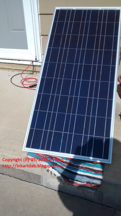 Readers familiar with my Off-Grid Mobile Battery cart will remember my writing about my plans to use solar panels to recharge the batteries. Reference Off-Grid Mobile Power Supply and Mobile Battery Cart Update for full background information. Over the past few months I have obtained a pair of brand new 100 watt solar panels from a supplier on eBay. I recently ordered the second panel and got it in the mail this week. I took advantage of the sunny weather and a breather from work today to test the panel "live" with the battery cart.